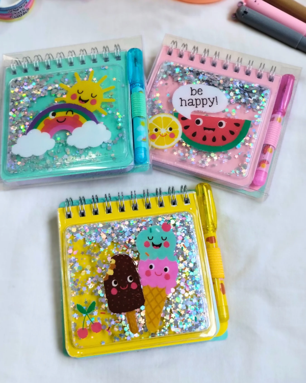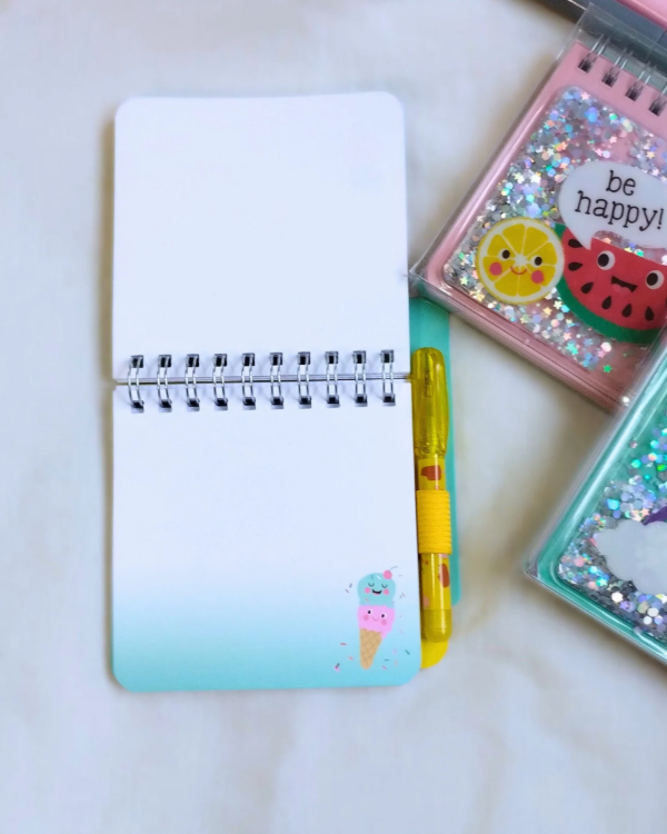 Mini anotador de tapa dura con brillos y lapicera de tinta azul.