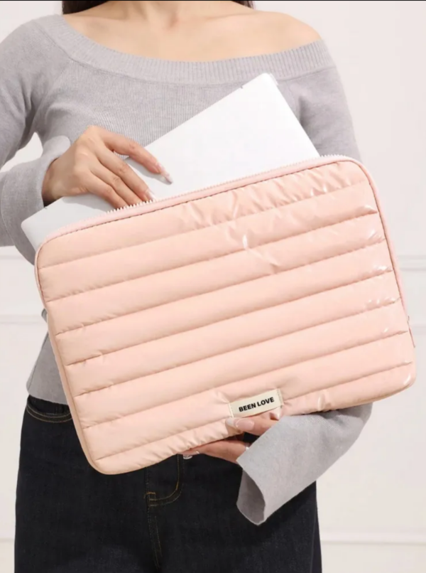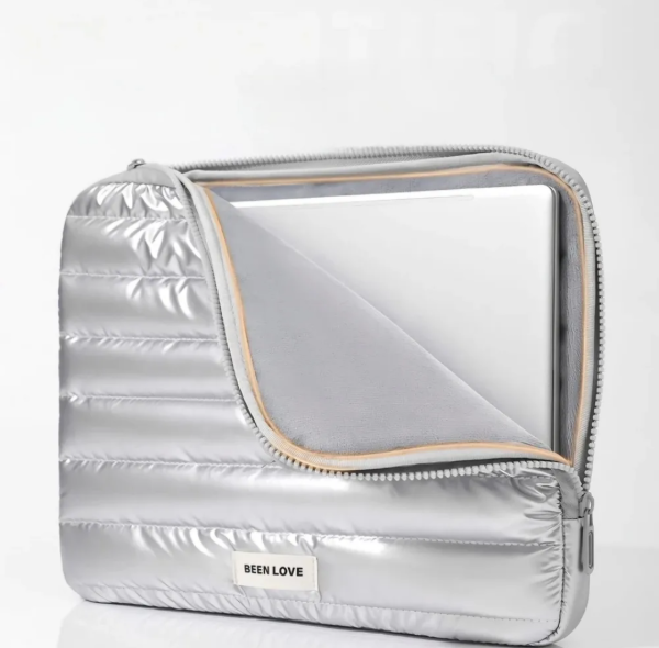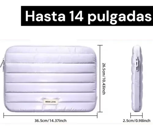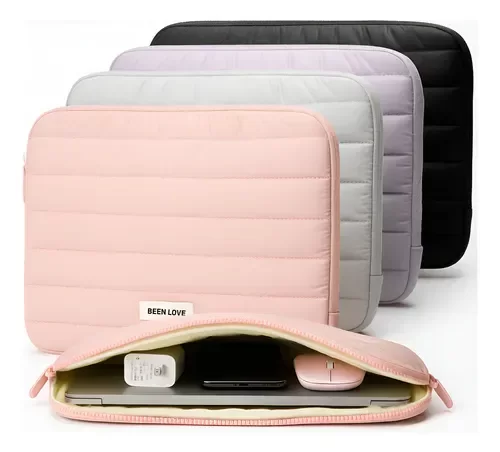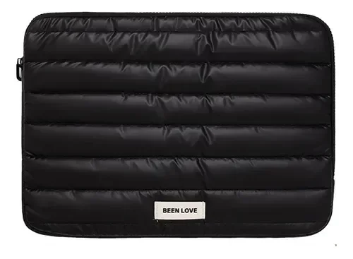 Funda puffer impermeable con interior acolchado para proteger la notebook. Doble cierre y fuelle para más espacio